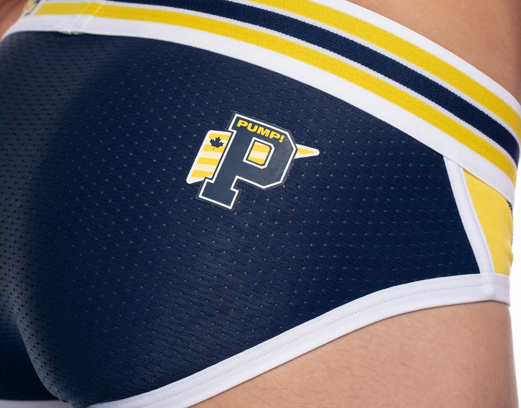 - White micromesh front panel with large sporty yellow piping and navy contrast stitching