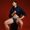 - Navy blue microfiber piping around cup, legs and crotch.